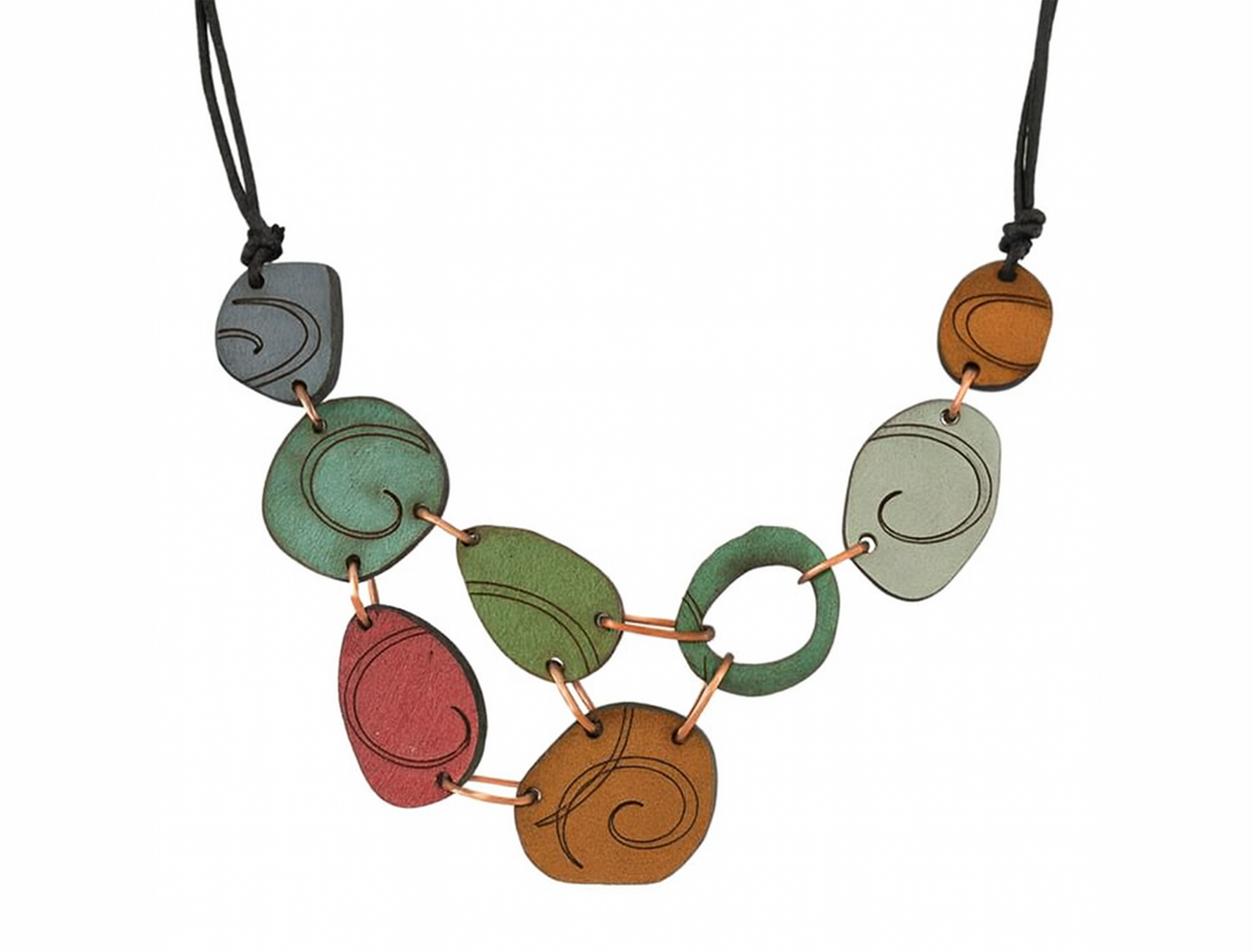 This wonderfully asymmetrical necklace is a dream to wear! Light weight Maple wood is hand-painted with a pleasing array of colors then laser cut and scored. It finishes with leather cord with adjustable sliding knot closure.